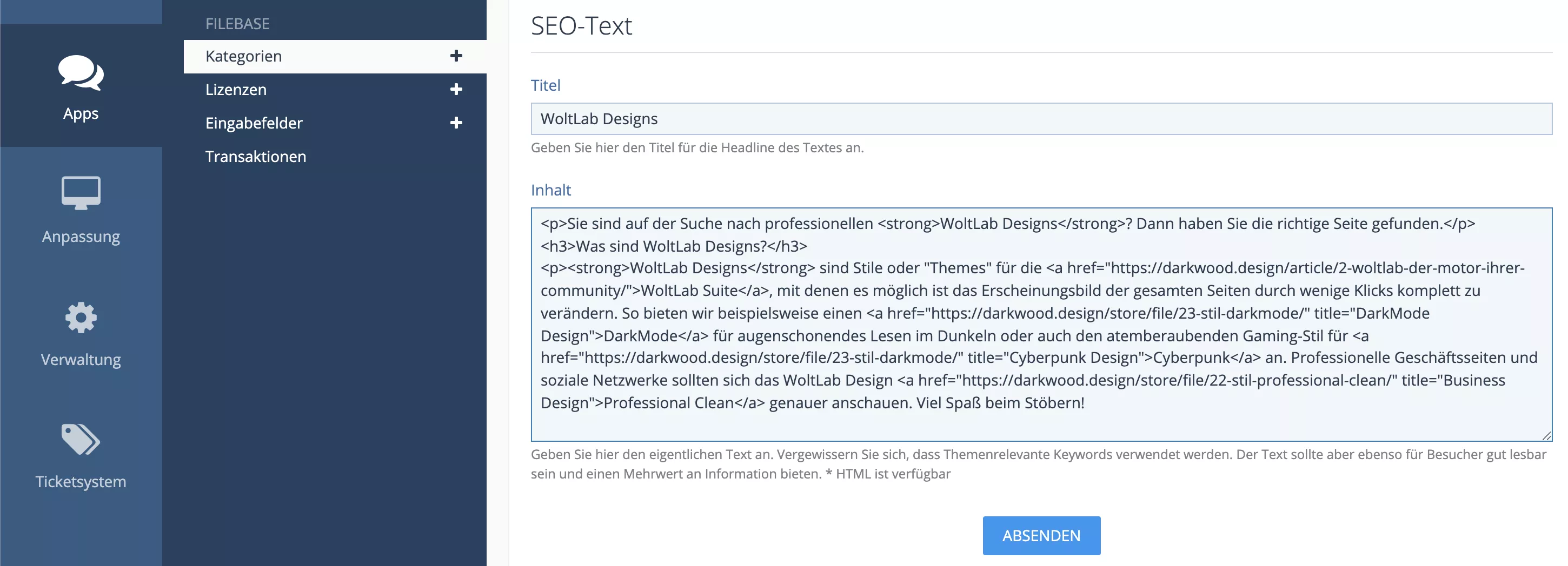 Als Ergänzung zum beliebten Forum SEO Texte Plugin gibt es nun auch die SEO-Texte für Kategorien. Somit sind die SEO-Texte nun auch in CMS-Artikel, Filebase, Gallery, Calendar, Blog, Ticketsystem, Vorschläge und überall wo sonst noch Kategorien genutzt werden verfügbar.
