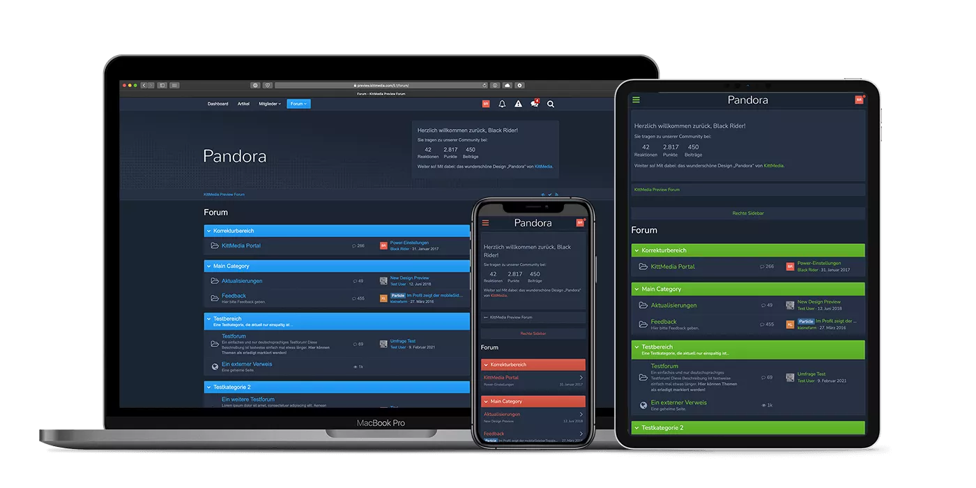 Ein klares, dunkles und dennoch farbenfrohes Design – das ist Pandora. Es kommt in vier verschiedenen Farben:blau, grün, orange und rot. Sein klares Design führt zu einer einfacheren Orientierung der Benutzer auf deiner Website. Außerdem bietet es herausragende Unterstützung für die Hero-Boxen deiner WoltLab Suite. Mehr dazu findest du in unserer Dokumentation.
