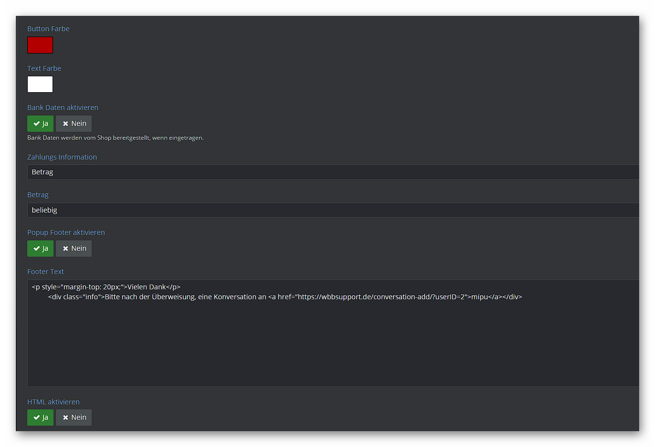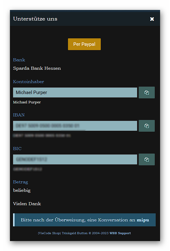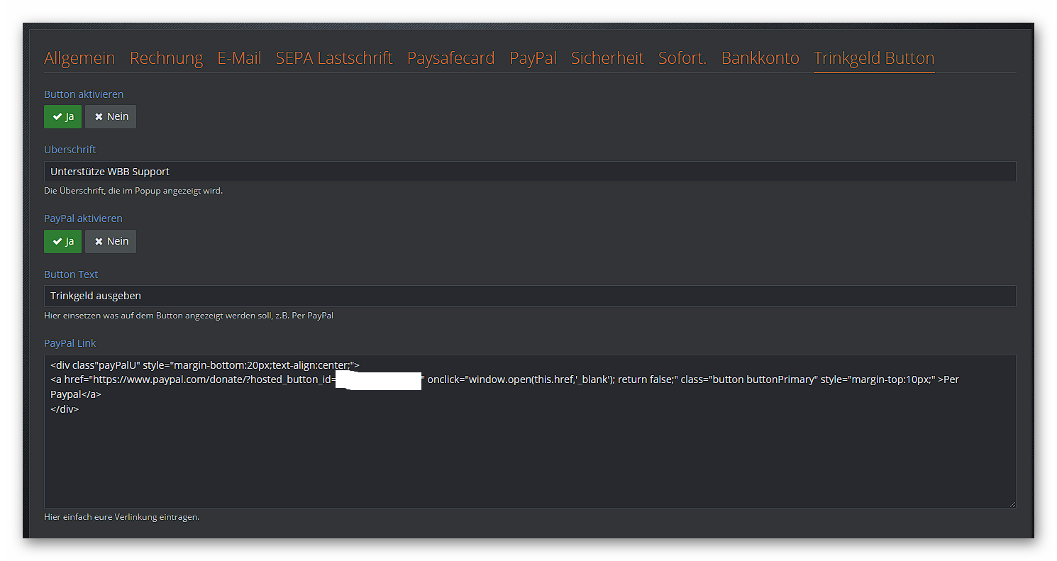 Dort befindet sich wenn aktiviert, ein Button zu PayPal oder der gleichen und die Bank Daten.